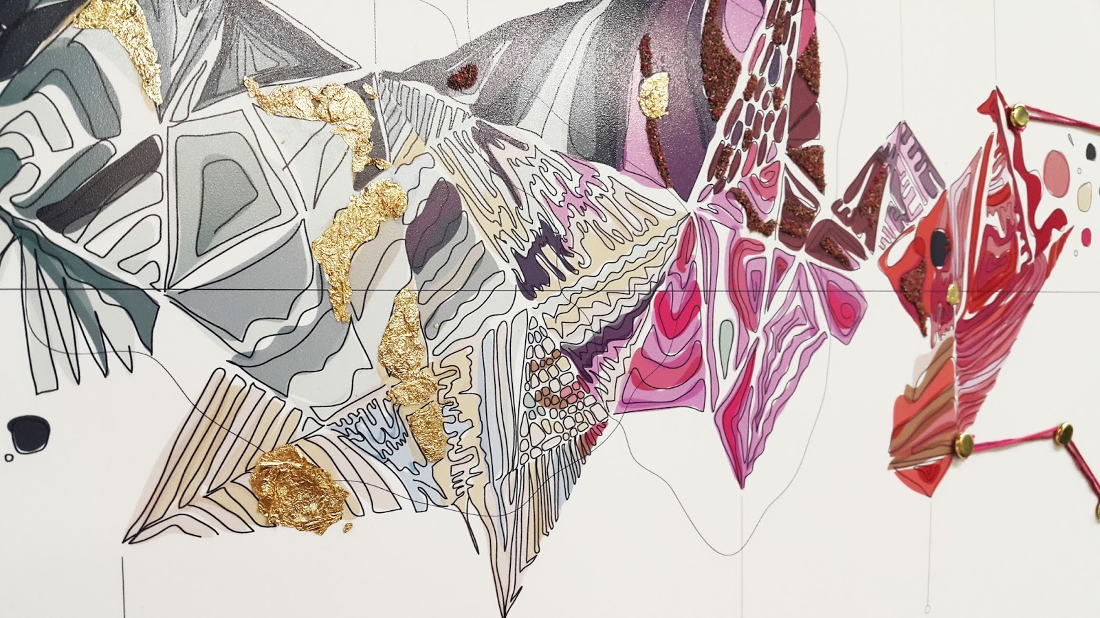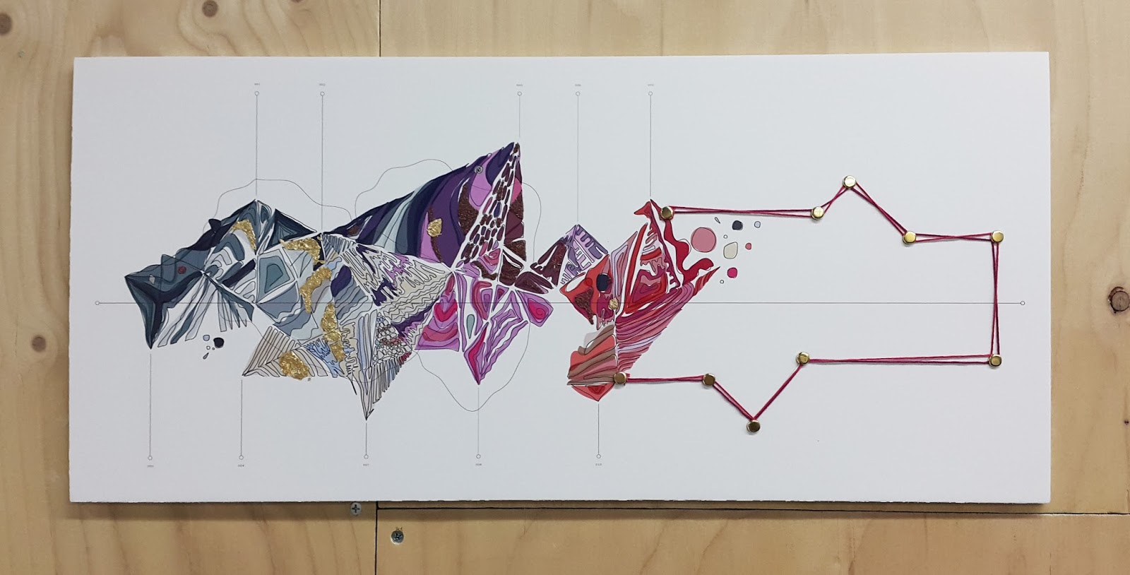الجزء الآخر المعبّر عنه بالخيوط الحمراء هو تصورها للمستقبل، لازالت حدوده واضحة تشبه المرحلة السابقة ولكنّه لم يعد دقيقاً ومفصلاً، لأن شخصيتها تغيرت بعد موقف مصيري مرّت به أعاد ترتيب الأمور في ذهنها، ووضعها في موقف فقدت فيه كامل السيطرة على كل شيء ما جعلها تعيد حساباتها وترخي من حدتها في اتخاذ القرارات. استعملت خطين للربط بين النقاط لأنّها أصبحت أكثر مرونة في وضع الاحتمالات لما قد يحصل لها بعكس الماضي حين كان توقع الأحداث مصيرياً وعدم الإلتزام بالخطة يعني نهاية العالم.